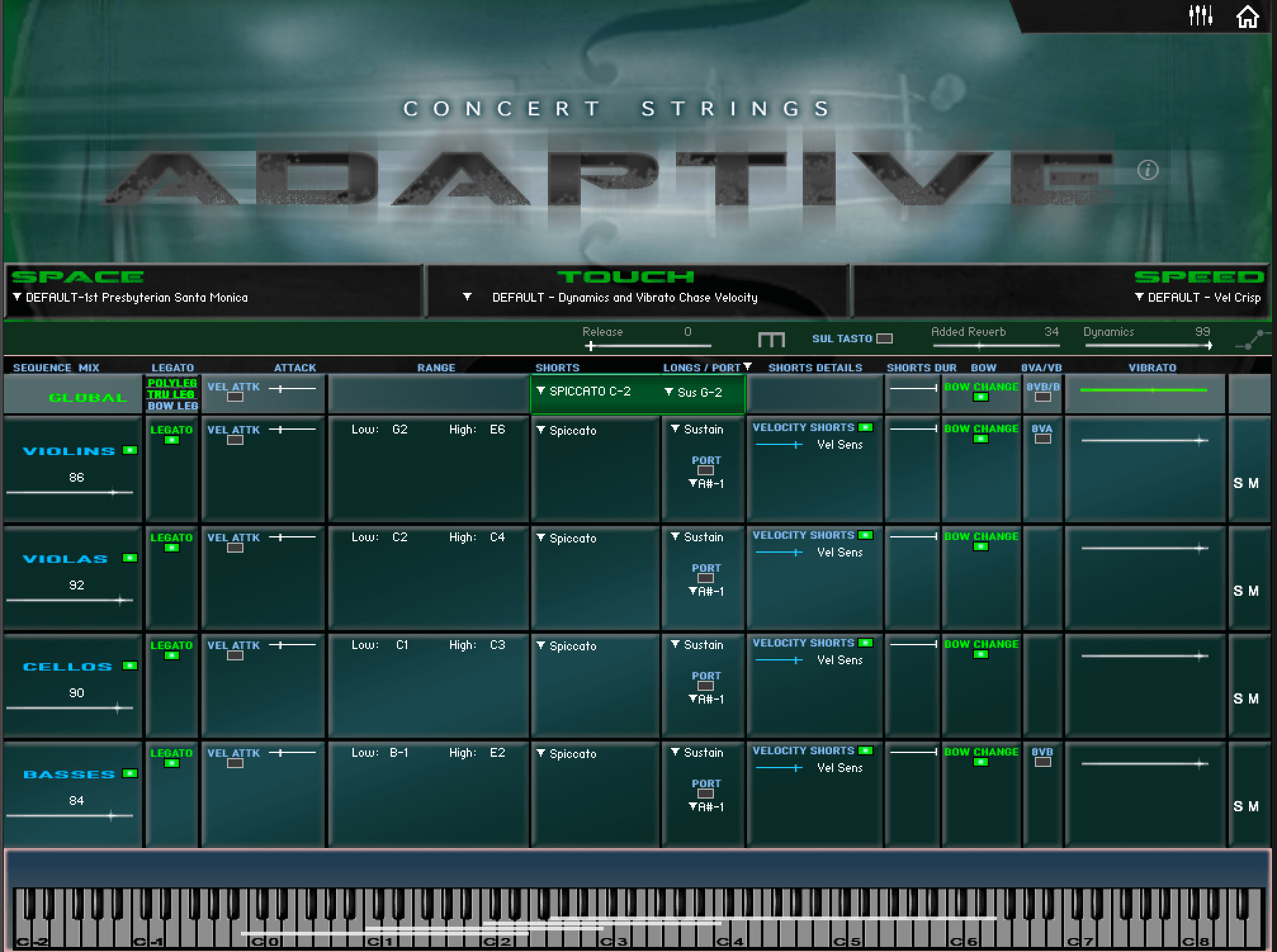 - For “ensemble” patches, each section can contain ANY short or long articulation (spiccato, staccato, detache, pizzicato, col legno, Bartok pizzicato, sustain, tremolo, major trill, minor trill).