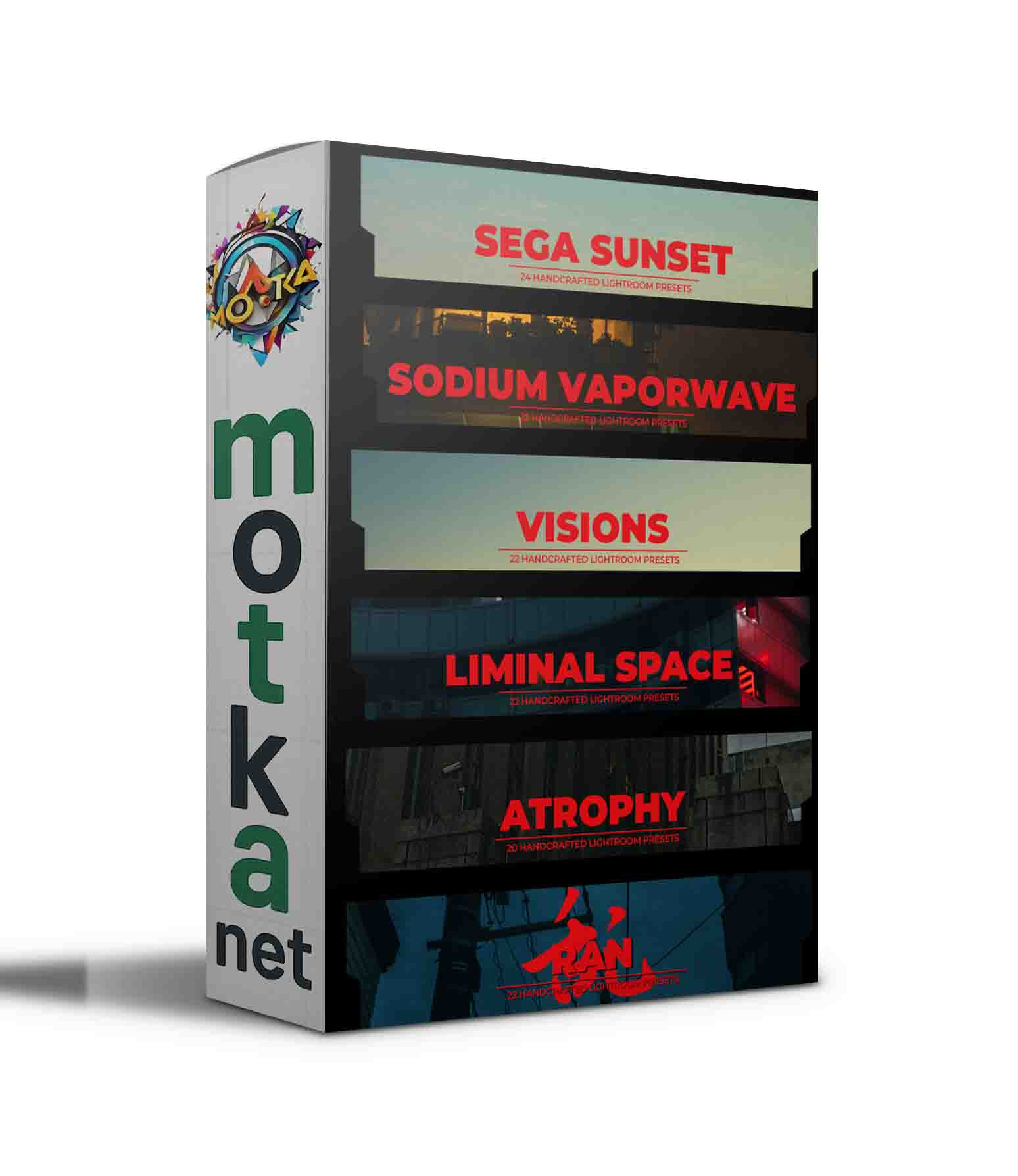 A bundle of all 6 GX Lightroom Preset Packs! Ran, Atrophy, Sega Sunset, Sodium Vaporwave, Visions and Liminal Space.