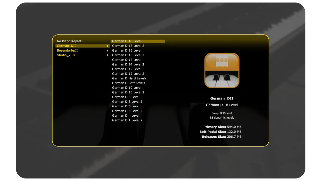 All Ivory II products come with the award-winning Ivory 2.5 engine and contains the full complement of Ivory II’s features such as Harmonic Resonance Modeling, Half Pedaling, Lid Position, Pedal Noise, and Tuning Tables to provide even greater detail and control. Additionally, features like Timbre Shifting, Parametric EQ, and new Synth Layer controls offer powerful new sound sculpting capabilities for custom piano programming and sound design.